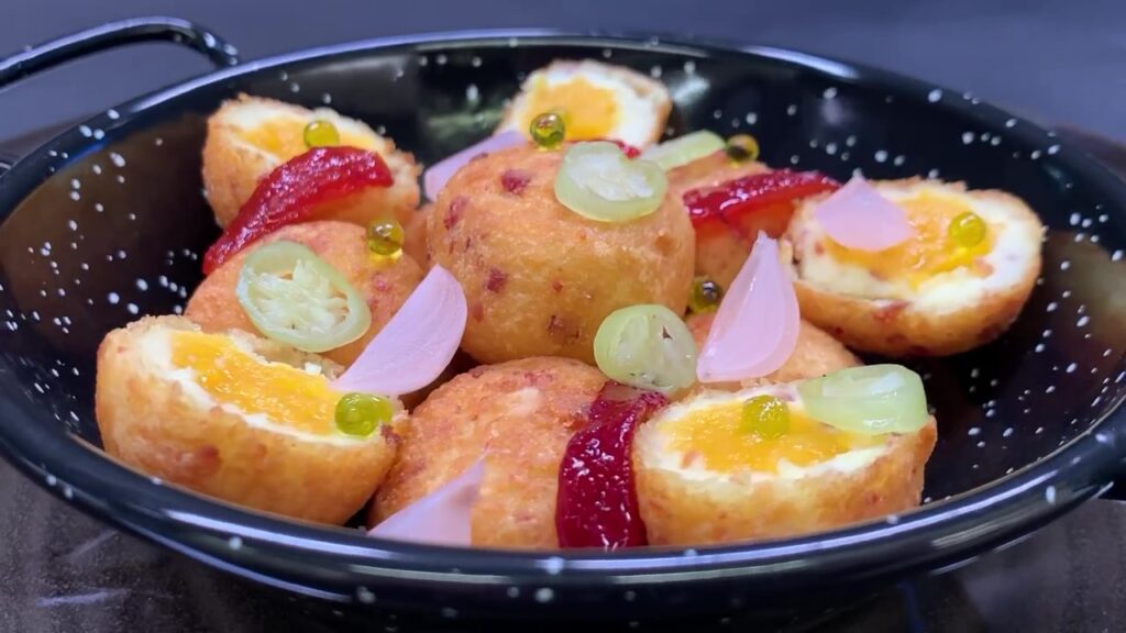 Ingredients: Referència Exquisitarium: 254 Ous trencats Ous trencats Pebrots rostits caramel·litzats Cebes adobades Perles d’oli d’oliva Rodanxes de bitxo en vinagre