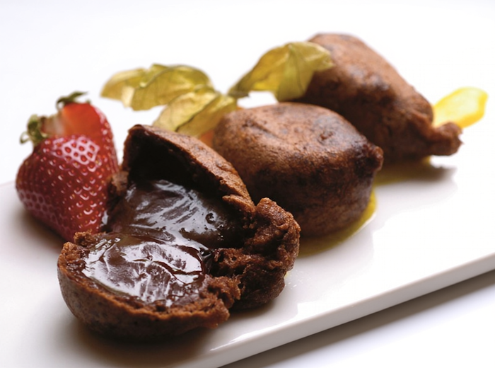 Bunyol de xocolata amb l’interior líquid que se serveix calent. Elaborat amb xocolata de primera qualitat. Es pot servir acompanyat d’una infinitat de productes: d’una crema anglesa o de gelats cítrics, amb els quals s’aconsegueix una combinació extraordinària de sabors. Disposem del producte en unitats individuals Cod. 31009, També es pot trobar en barquetes de 3 unitats amb salsa de cítrics 120g Cod. 3100.