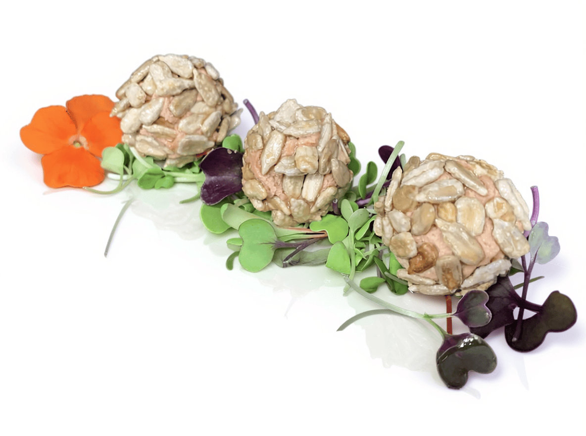Cremige Füllung mit Foie, garniert mit karamellisierten Kernen. Man kann den kontrastreichen Geschmack der karamellisierten Kerne wahrnehmen, der perfekt mit der Foie verschmilzt. Das Gericht wird im Bonbon-Format angeboten, sodass es als Vorspeise serviert werden kann.