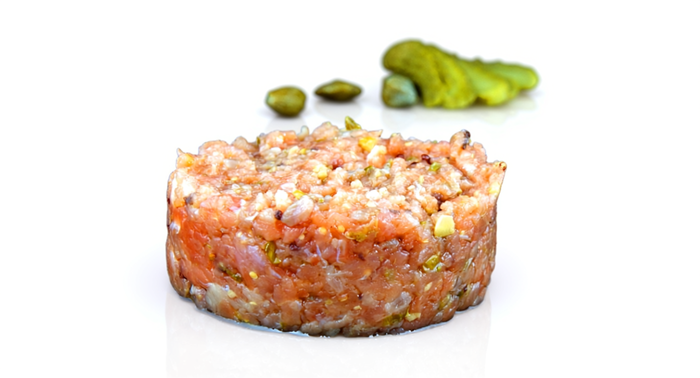 Tatar aus Lachs. Gewürfelter Räucherlachs, angerichtet mit einer erfrischenden Kombination aus Gemüse und Gurken. Unendliche Serviermöglichkeiten – kann als Vorspeise auf einem japanischen Löffel präsentiert werden. Ideal als Vorspeise, mit Salat oder Guacamole als Beilage.