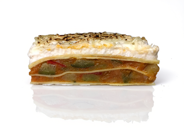 Layers of fresh pasta with Bolognese sauce in between, made of high-quality products and covered in a creamy béchamel sauce. This delicious recipe only needs a few minutes to be prepared. It’s served in individual 300 g portion containers (code 16012), but can also be served in a 2.5 kg pan (code 16019).