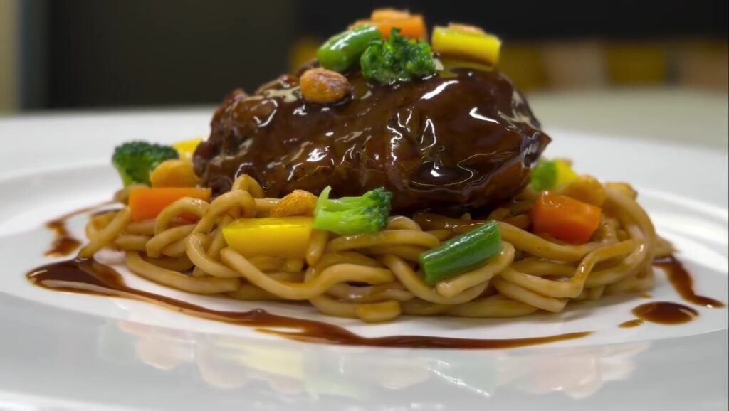 Ingredientes: Referencia Exquisitarium: 27007, carrillera de vacuno confitada y deshuesada. Carrillera de vacuno confitada y deshuesada. Noodles Salsa moscatel Verduritas al vapor: