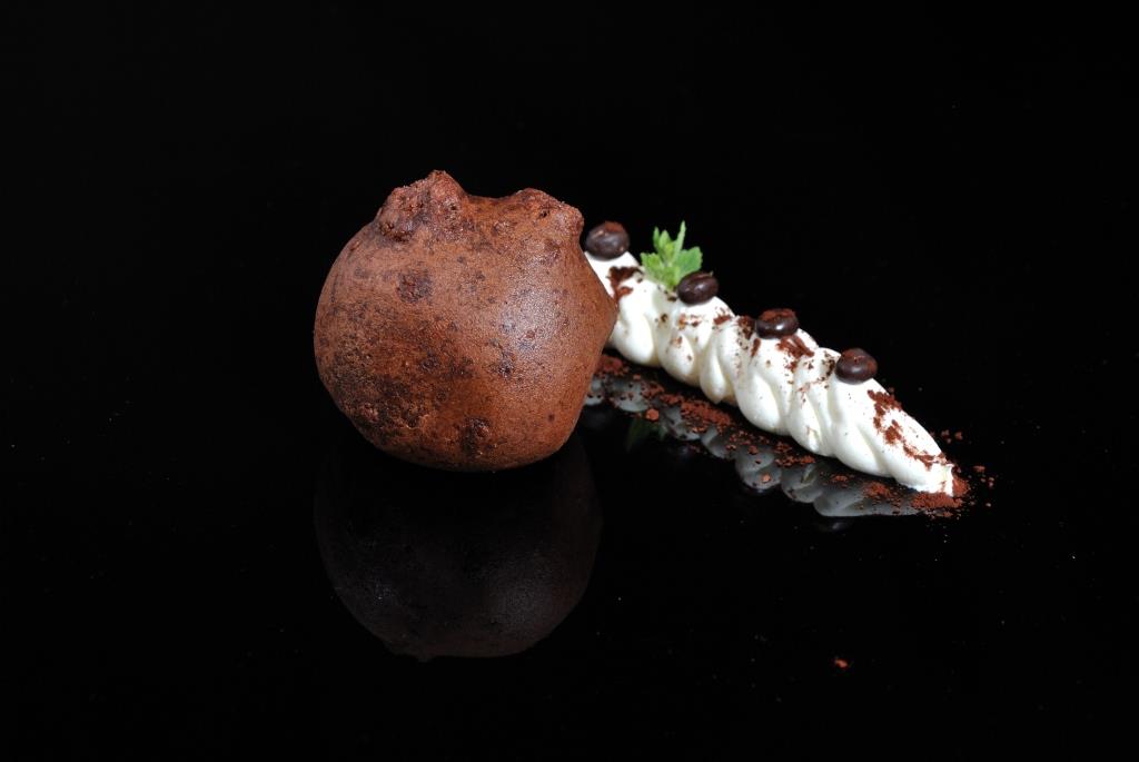 Delicioso buñuelo con un exterior de chocolate relleno de tiramisú, elaborado con un irresistible mascarpone y café. Ideal para servirse frío. Una forma original y tentadora para saborear el tiramisú.