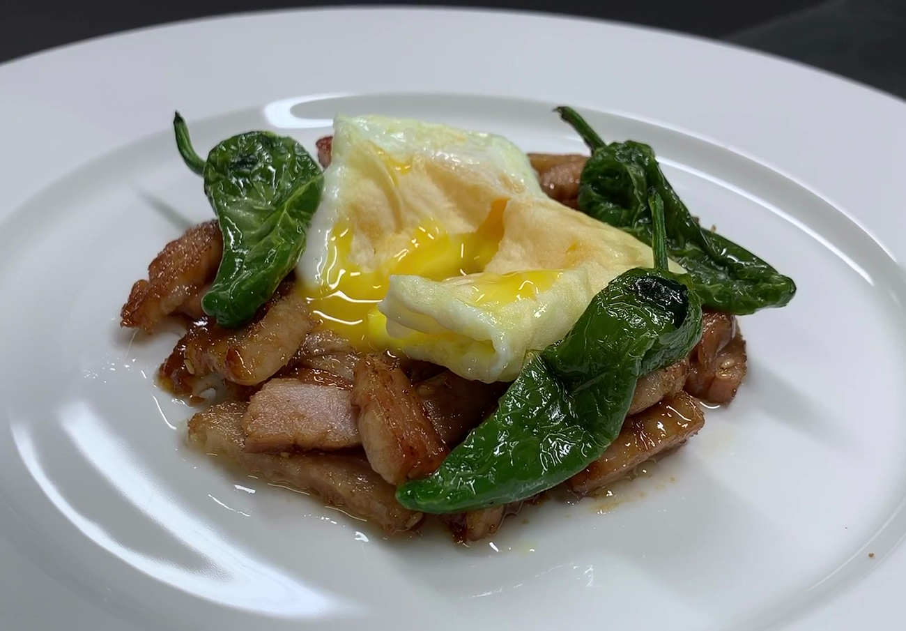 Secreto ibérico confitado con salsa yakiniku, ravioli de huevo y pimientos del padrón